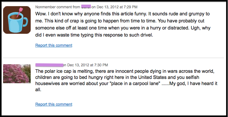 The other day I wrote a rant about someone cutting me off in the carpool lane. It was for a site I love, TheStir, where most of the readers don’t know me my motivation, sense of irony, and penchant for poking fun at cliches and stereotypes. As any blogger knows, the comments on major sites can be pretty harsh. Some of them mentioned how trite my article was, “The polar ice caps are melting … and people starving in our own backyards?” “Why did I even waste time typing this response to such drivel.”