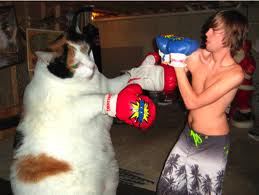 So, in yesterday’s post, Why They Should Have Cat Boxing at Camp or What Happens When You Have to Send Letters about your Boring Summer, I had a stroke of brilliance. Unfortunately, I was not the first — and so, I cannot take credit for inventing “Cat Boxing.” Of course, I’d like to because let’s face it, it’s pretty ingenious. I guess exceptionally gifted *genii like myself should expect set backs in a world where most of the thoughts have already been thunk. Therefore, I’ve added some addendum’s to yesterday’s post to ensure that I don’t get sued by rabid cat lawyers.